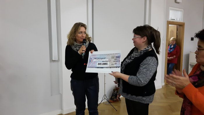 MdB Caren Lay übergibt den Spendenscheck an Frau Deis vom Majak e.V.