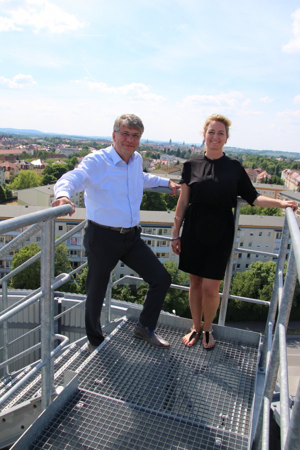 Aus diesem Anlass besuchte die Lausitzer Bundestagsabgeordneten Caren Lay das neue, hocheffiziente Energiezentrum in Bautzen und stieg zusammen mit dem Geschäftsführer der Bautzner Energie- und Wasserwerke (EWB), Volker Bartko, auf den 35 Meter hohen Energieturm. Der Blick über Bautzen verdeutlichte noch einmal, was kommunale Daseinsvorsorge bedeutet: die Fernwärme für viele tausend Wohnungen in der Stadt wird vom neuen Heizkraftwerk aus ressourcenschonend und emissionsarm sichergestellt. .