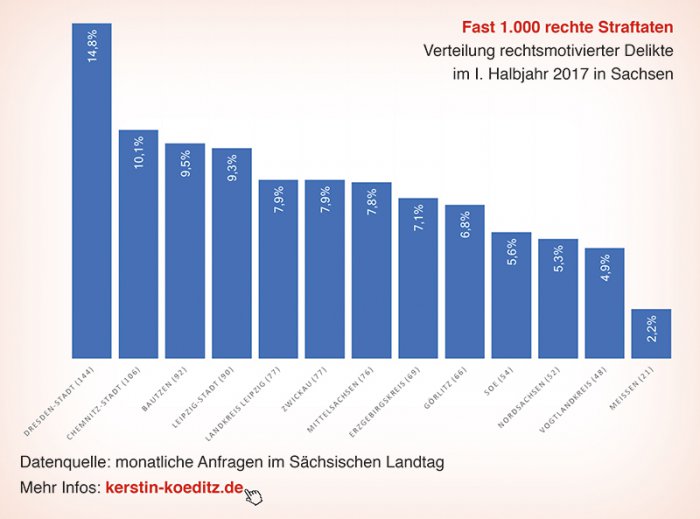 Hintergrund: Laut den monatlichen Kleinen Anfragen von MdL Köditz an die sächsische Staatsregierung gab es im ersten Halbjahr 2017 92 Straftaten aus dem Bereich Rechts im Landkreis Bautzen. Das sind 9,5% aller Straftaten aus diesem Bereich im ganzen Freistaat und der Landkreis liegt damit an der Spitze der Flächenlandkreise, nur hinter Dresden (144 Straftaten) und Chemnitz (106). Laut MdL Köditz ist davon auszugehen, dass sich die Zahlen noch erhöhen werden, da erfahrungsgemäß weitere Straftaten mit Verzögerung in den Bereich Rechts einsortiert werden.