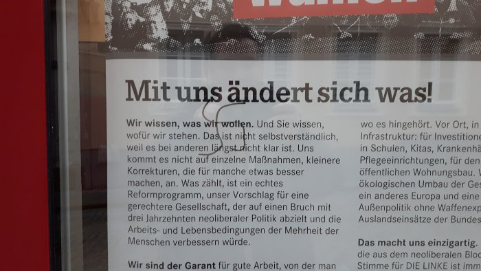 In der Nacht vom 23. zum 24.01. wurde am Bautzner Wahlkreisbüro der Bundestagsabgeordneten Caren Lay ein Hakenkreuz an einer der Schaufensterscheiben aufgebracht. Ein Wahlkreismitarbeiter entdeckte das verfassungswidrige Zeichen am Morgen, das zuständige Polizeirevier Bautzen wurde umgehend informiert. "Wir lassen uns nicht einschüchtern." so Caren Lay in Reaktion auf den Vorfall.