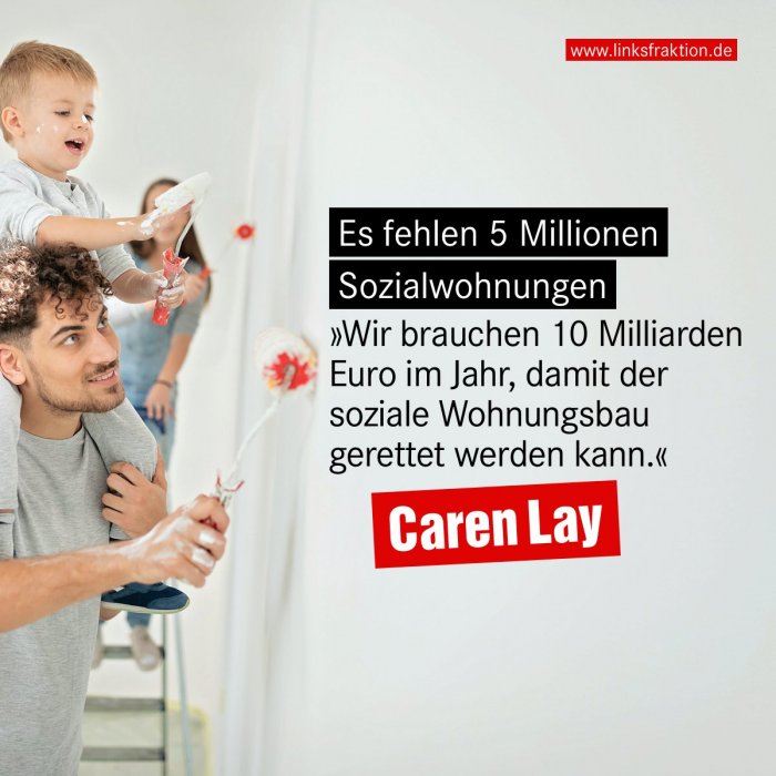 „Der Niedergang des sozialen Wohnungsbaus geht ungebremst weiter. Der Bestand der Sozialwohnungen befindet sich auf einem historischen Tiefstand, obwohl Sozialwohnungen gerade angesichts der Mietenexplosion in den Großstädten wichtiger denn je wären. Die Kürzung der Bundesförderung für den sozialen Wohnungsbau auf nur 1 Milliarde Euro für das gesamte Bundesgebiet im aktuellen Haushaltsjahr ist unverantwortlich und muss schnellstmöglich korrigiert werden! Wir brauchen 10 Milliarden Euro im Jahr, damit der soziale Wohnungsbau gerettet werden kann!“