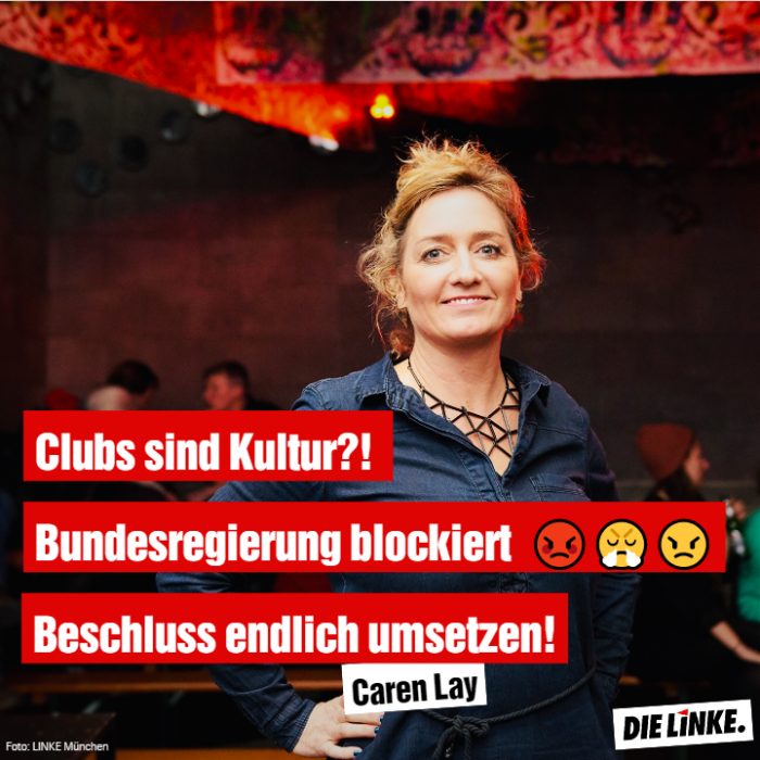 „Die Bundesregierung weigert sich beharrlich, die Anerkennung von Clubs als Kultureinrichtungen umzusetzen. Der vom Parlamentarischen Clubforum herbeigeführte und im Bundestag von allen demokratischen Fraktionen breit getragene Beschluss, Clubs als Kultur anzuerkennen, harrt der Umsetzung durch das Bauministerium. Das ist unverständlich und unerhört. Wenn Clubs nicht endlich baurechtlich mit anderen Kulturstätten gleichgestellt werden, wird das Clubsterben weitergehen. Das darf nicht passieren. Ich erwarte die Umsetzung noch in dieser Legislatur, sonst waren eineinhalb Jahre Arbeit des Clubforums für die Katz‘“, so Caren Lay, stellvertretende Vorsitzende und baupolitische Sprecherin der Fraktion DIE LINKE. Im Bundestag, die im vergangenen Jahr das Parlamentarische Forum Clubkultur mit Abgeordneten aller demokratischen Fraktionen initiierte.