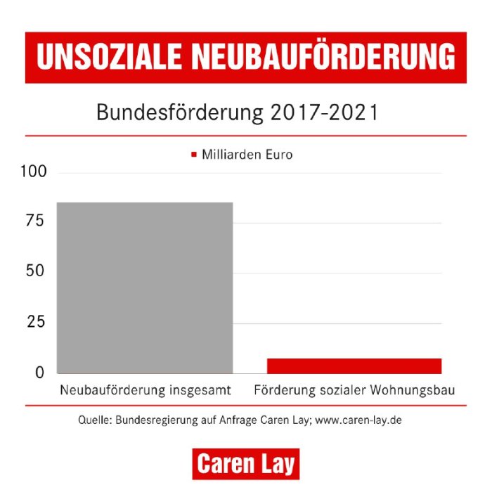 Meine Anfrage an die Bundesregierung ergab: In den vergangenen fünf Jahren wurden insgesamt 85 Milliarden Euro Neubauförderung des Bundes über die KfW verteilt. Demgegenüber wurden nur 7,5 Milliarden Euro für den sozialen Wohnungsbau ausgegeben.