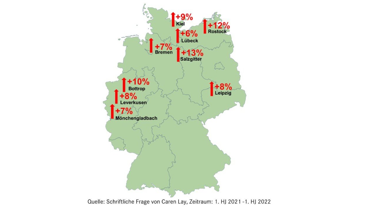 Im vergangenen Jahr sind nicht nur in den einschlägig bekannten Metropolen und Hotspots die Mieten gestiegen. Besonders hoch war Anstieg vom ersten Halbjahr 2021 bis Ende des ersten Halbjahres 2022 in Salzgitter (Niedersachsen) mit einem Anstieg der Preise für Erst- und Wiedervermietungen von 13 Prozent. Zweistellige Anstiege verzeichneten auch Rostock mit 12 und Bottrop mit 10 Prozent innerhalb von nur zwölf Monaten. Unter den Top 10 Städten mit den am stärksten steigenden Preisen für Wohnungsmieten finden sich außerdem Kiel (9%), Leverkusen und Leipzig (8%), Bremen und Mönchengladbach (7%), Krefeld und Lübeck (6%). Das geht aus der Antwort der Bundesregierung auf eine Anfrage von Caren Lay, mieten- und wohnungspolitische Sprecherin der Fraktion DIE LINKE. im Bundestag, hervor.