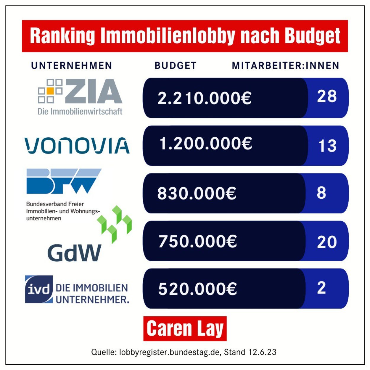 Die Kategorie „Raumordnung, Bau und Wohnen“ ist mit 690 Einträgen eines der kleinsten Themengebiete. Selbst eine konservative Zusammenstellung der Organisationen, die hauptsächlich im Immobilienbereich lobbyieren, ergibt ein mehr als ungleiches Verhältnis zwischen den Interessensvertretungen der Immobilien- und denen der Mietenseite. Dieses ungleiche Verhältnis besteht im Februar 2023 trotz einiger Änderungen im Detail weiter. Zusammenfassend ist zu sagen, dass die Immobilienlobby weniger Geld (ca. 300.000€ weniger) ausgibt als im Sommer 2022, aber über 10 hauptamtliche Mitarbeiter*innen mehr verfügt. Finanzielle Mittel drastisch gekürzt wurden z.B. beim Verband GdW (um 200.000€) und beim Deutsche Wohnen – Konzern (um mehr als 550.000€). Währenddessen haben beispielsweise die Vonovia SE (um mehr als 200.000€) und der VdW Rheinland (um 200.000€) ihr Budget deutlich erhöht. Insbesondere die Verbände der Immobilienlobby auf Bundesebene haben mehr Lobbyist*innen eingestellt (z.B. ZIA: +3, GdW +2, BFW +2), während die Deutsche Wohnen offiziell über keine*n hauptamtliche*n Lobby-Mitarbeiter*in mehr verfügt. Auf der Mieter*innen-Seite hat der Deutsche Mieterbund sein Budget um lediglich 10.000€ erhöht.