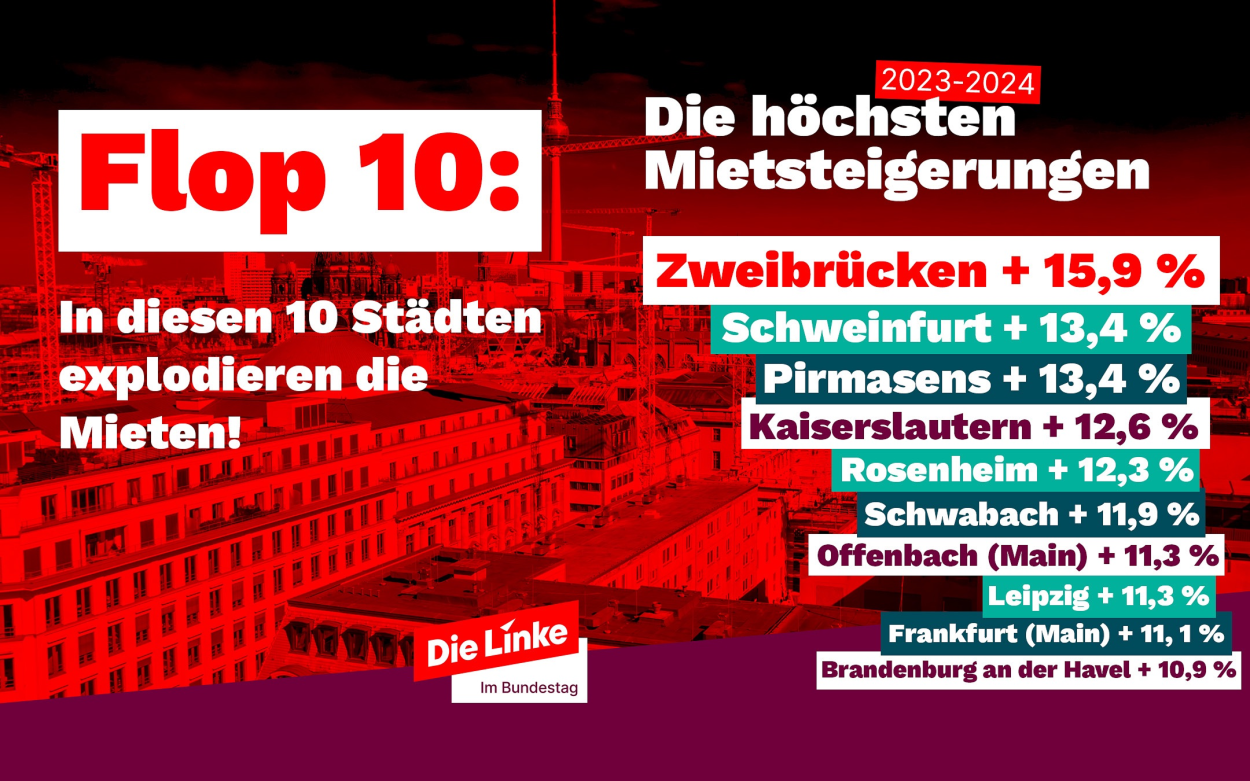 Die Mietenkrise betrifft nicht nur die Ballungszentren. Längst sind auch Kleinstädte und ländliche Regionen betroffen. Wer heute eine Wohnung mieten will, muss bis zu 16 Prozent mehr zahlen als noch ein Jahr zuvor. Da Löhne nicht in gleichem Maße steigen, bedeuten die Mietsteigerungen die Verarmung von Mieterinnen und Mietern mit geringen Einkommen und eine Überlastung bis in die Mittelschicht hinein. Zudem treffen die Mietsteigerungen auch den Staat, der bei Wohn- und Bürgergeld immer höhere Mieten an Vermieter bezuschussen muss. Um den Mietsteigerungen Einhalt zu gebieten, braucht es einen bundesweiten Mietendeckel mit kommunalen Mietobergrenzen und einer ortsbezogenen Deckelung bei der Wiedervermietung.
