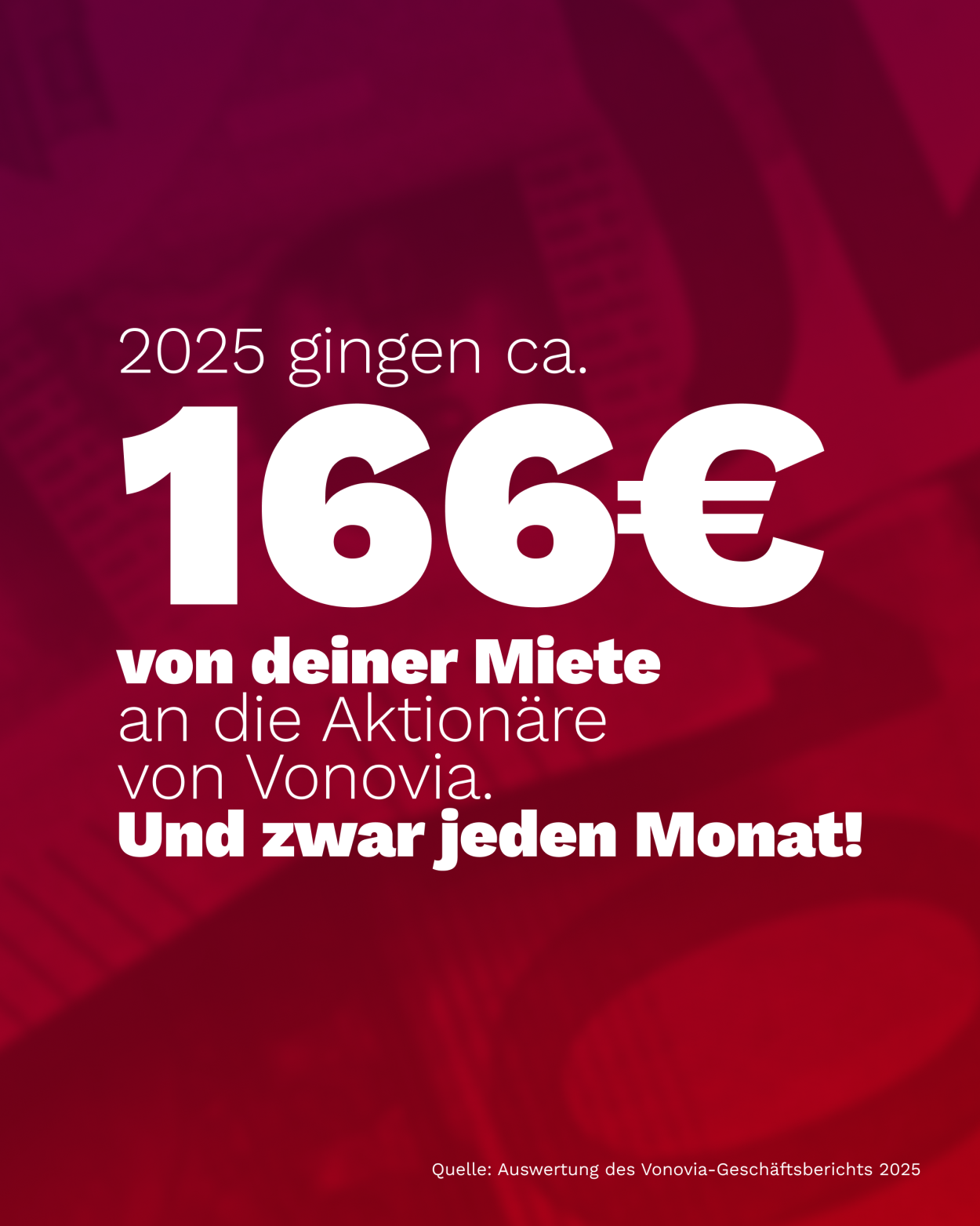Der Konzern erhöhte die Mieten 2025 im Schnitt um 4,1 Prozent. Vonovia-Mieter:innen zahlten 2025 jeden Monat 166 € ihrer Miete an die Aktionär:innen des Konzerns.