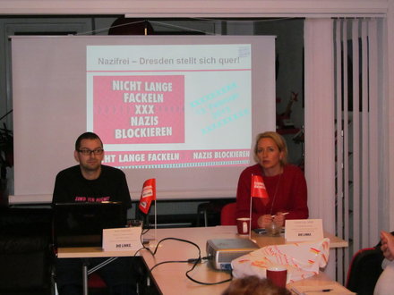Jens Thöricht von der Landesarbeitsgemeinschaft Antifaschistische Politik der Sächsischen LINKEN ging noch einmal auf den historischen Kontext und die erfolgreiche Entwicklung der Initiative ein und gab einen Ausblick auf die Planungen in diesem Jahr. Dabei soll es neben friedlicher Blockade wieder einen Täterspurenmahngang geben. Dieser soll einen Kontrapunkt zur inakzeptablen Erinnerungskultur der Stadt Dresden setzen und sich kritisch mit der Rolle Dresdens und dem Leben und Wirken von Täterinnen und Tätern aus Dresden im Nationalsozialismus auseinandersetzen.