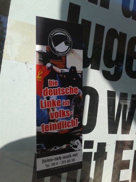 Die Aufkleber tragen die Schriftzüge „NS-Zone. Deutschland Multikulti – wir bleiben braun. Good night left side“ und „Nationale Sozialisten Deutschland. Die deutsche Linke ist volksfeindlich.“