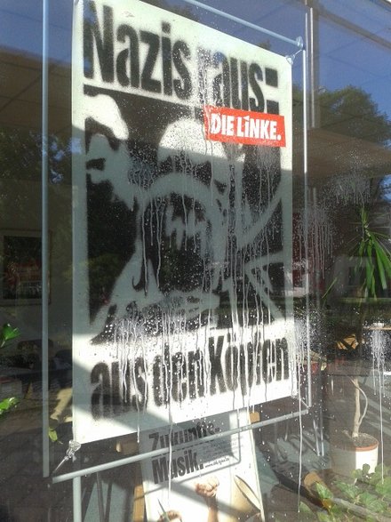 „Drei Tage vor der Wahl zum Stadtrat, zum Kreistag und zum Europäischen Parlament mussten wir heute Morgen feststellen, dass Aufkleber an den Scheiben des Büros angebracht waren sowie Farbschmierereien auf das Glas aufgetragen worden sind.