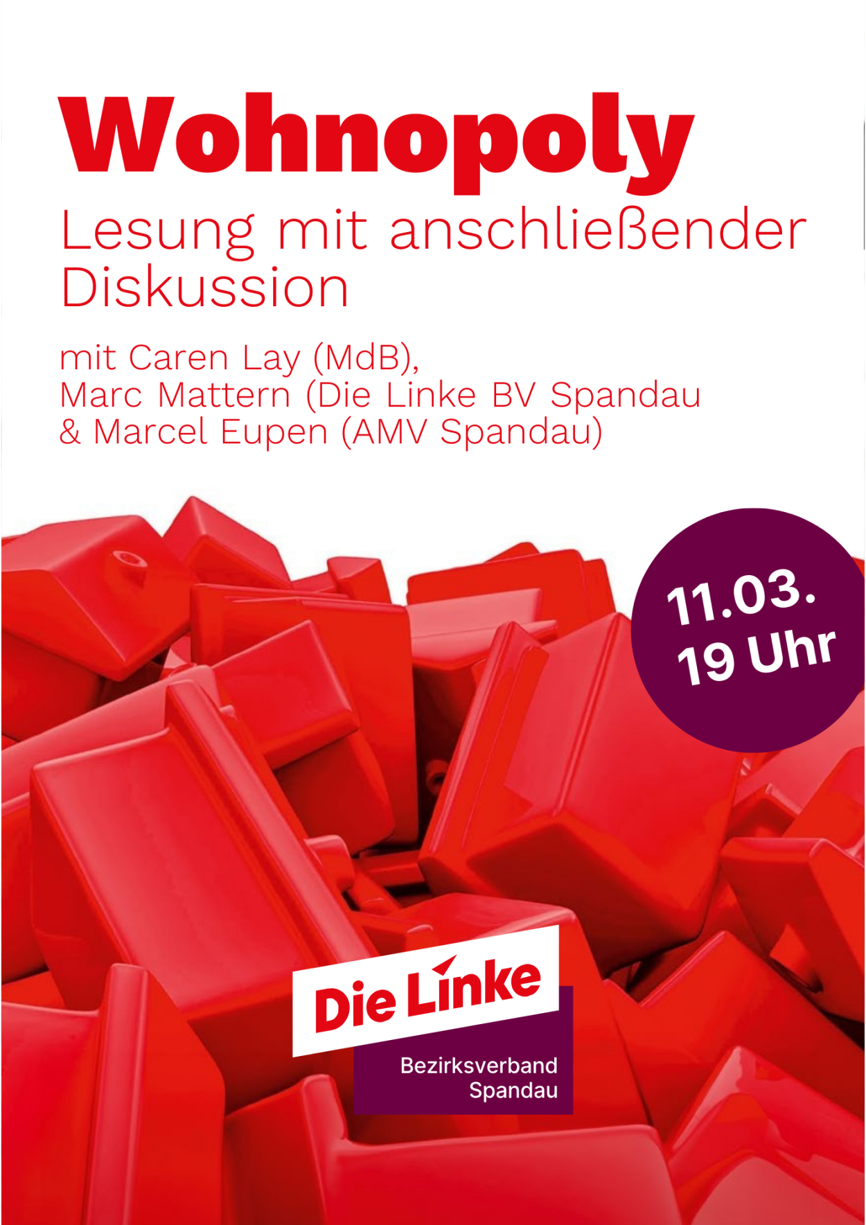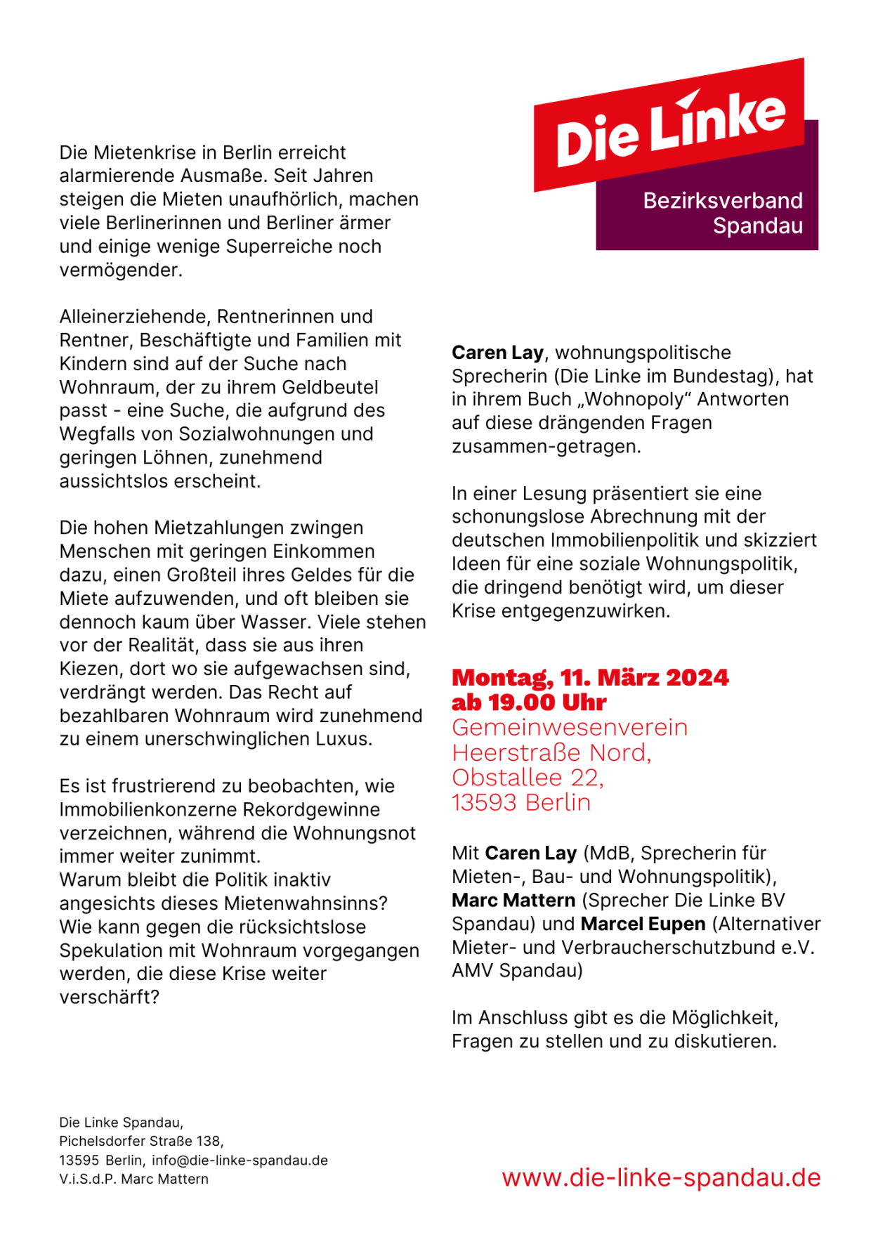 Mit einer Einführung von Marcel Eupen (Alternativer Mieter- und Verbraucherschutzbund) und anschließender Diskussion. Am Montag, den 11. März, um 18 Uhr im Gemeinwesenverein in Staaken.