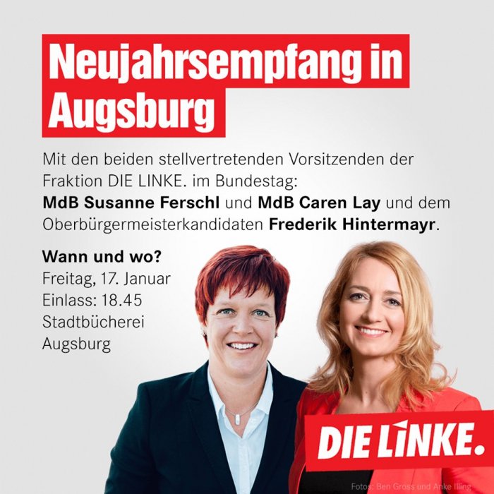 Am 17. Januar 2020 wird Caren Lay gemeinsam mit ihrer Kollegin Susanne Ferschl beim Neujahrsempfang des Kreisverbandes DIE LINKE. Augsburg vor Ort sein.