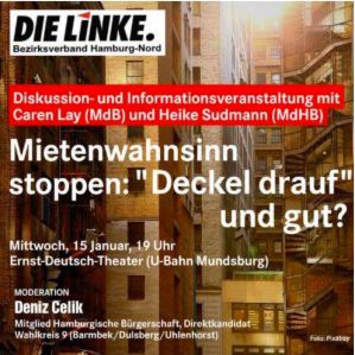 Am 15. Januar 2020 wird Caren Lay bei einer Veranstaltung der Fraktion DIE LINKE. in der Hamburgischen Bürgerschaft mit Heike Sudmann, stellv. Vorsitzende und Sprecherin für Stadtentwicklungs-, Wohnungs- und Verkehrspolitik der Hamburger Fraktion über den Mietendeckel als Instrument im Kampf gegen den Mietenwahnsinn diskutieren.